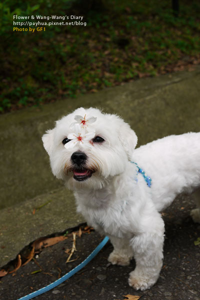 終於等到一朵花從天上掉下來, 馬上撿來放旺旺鼻子